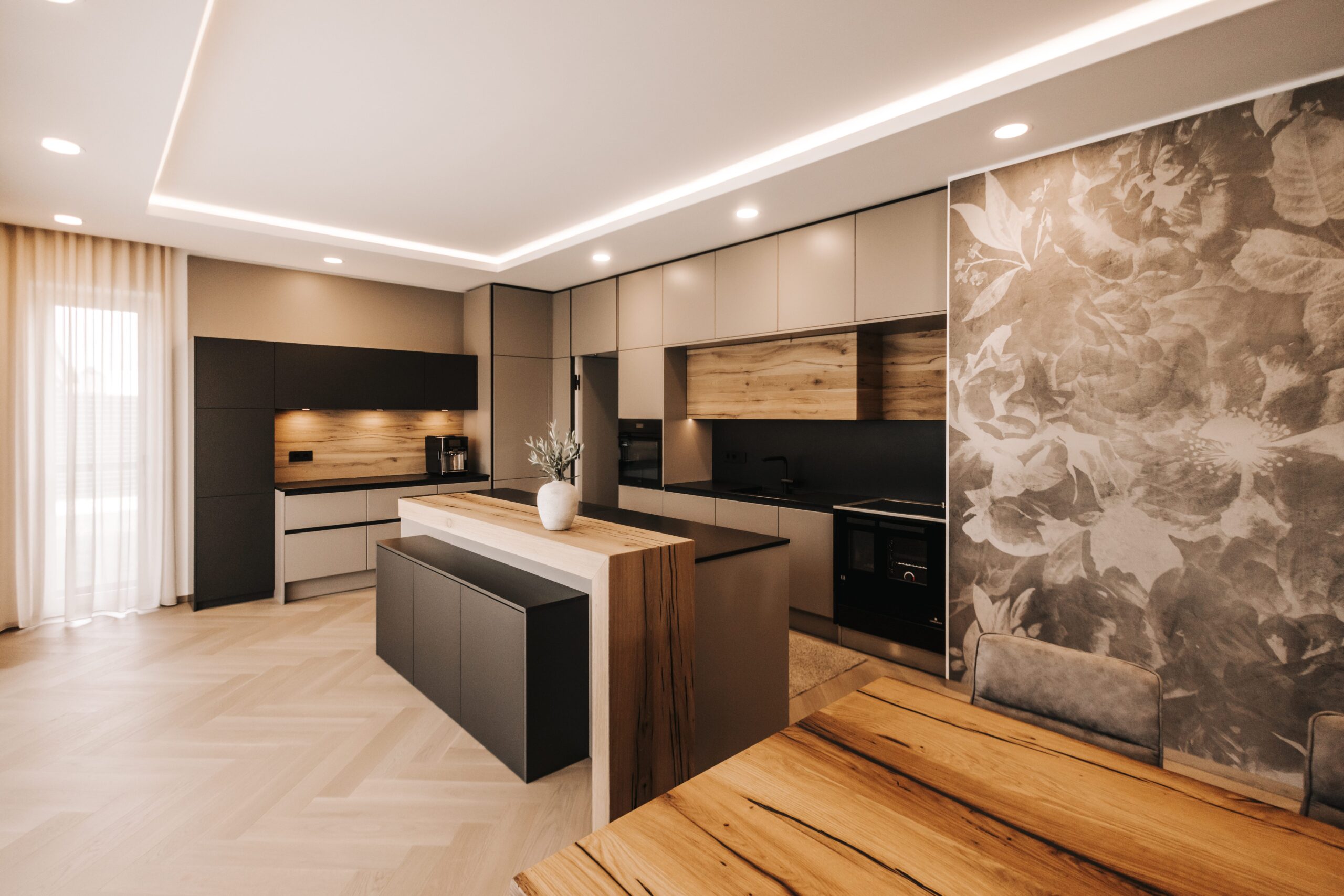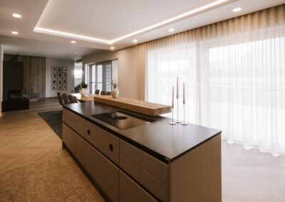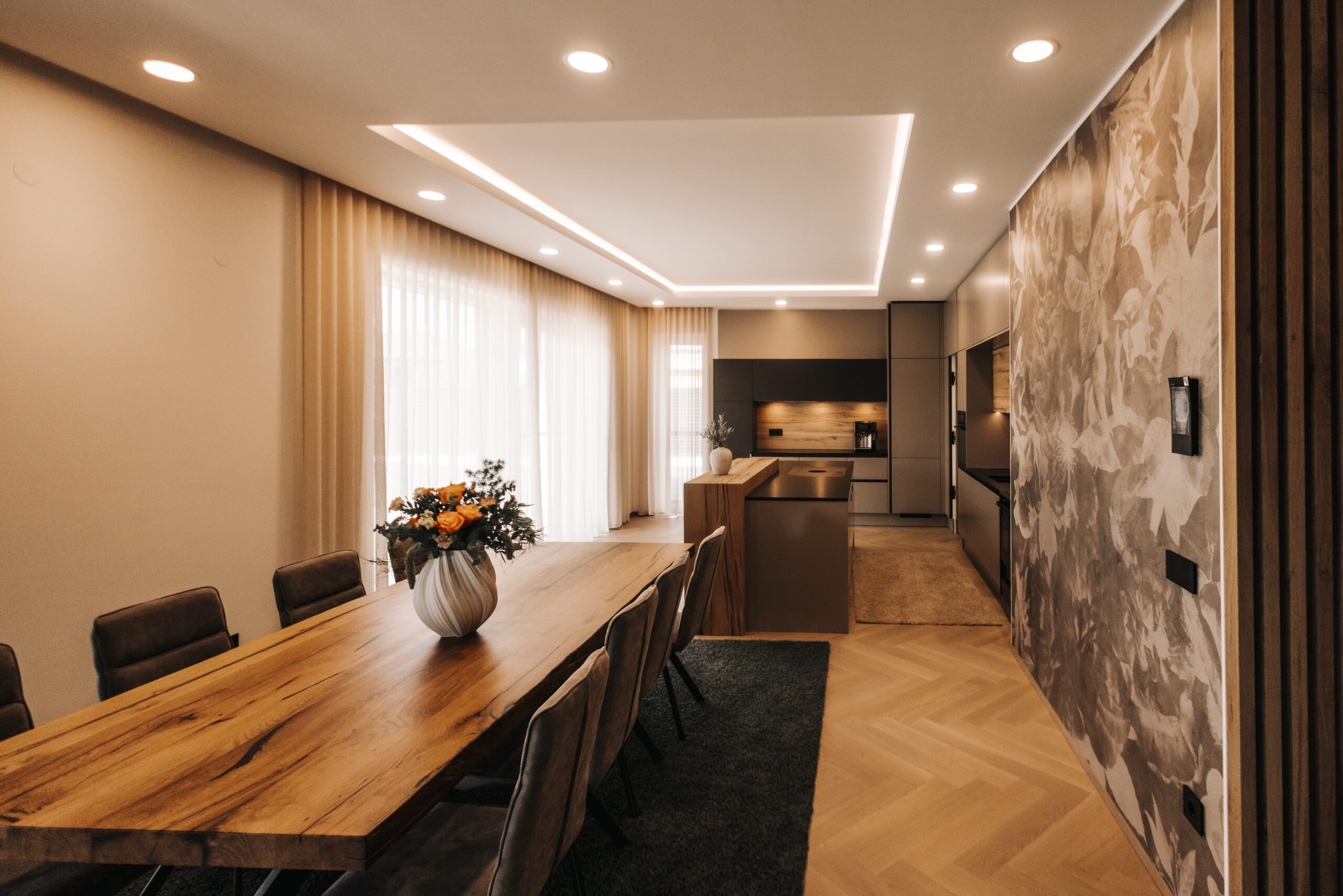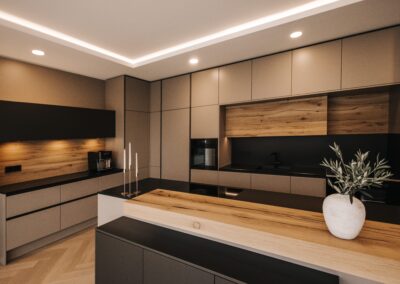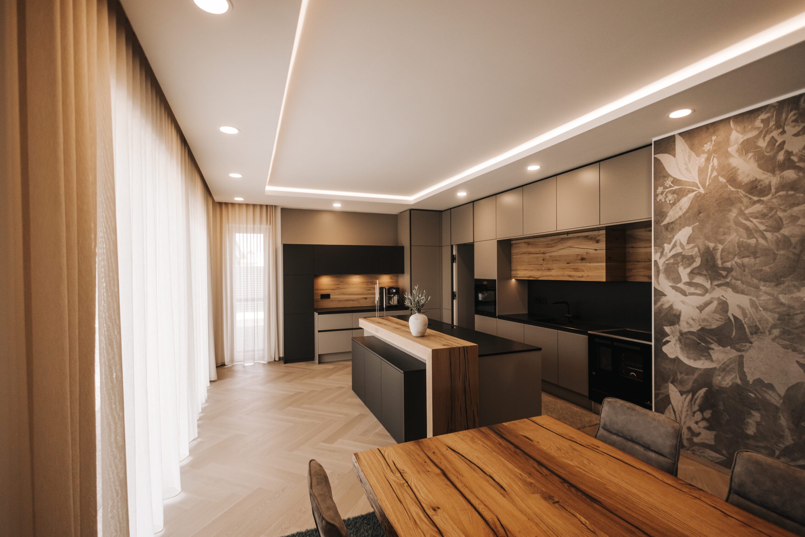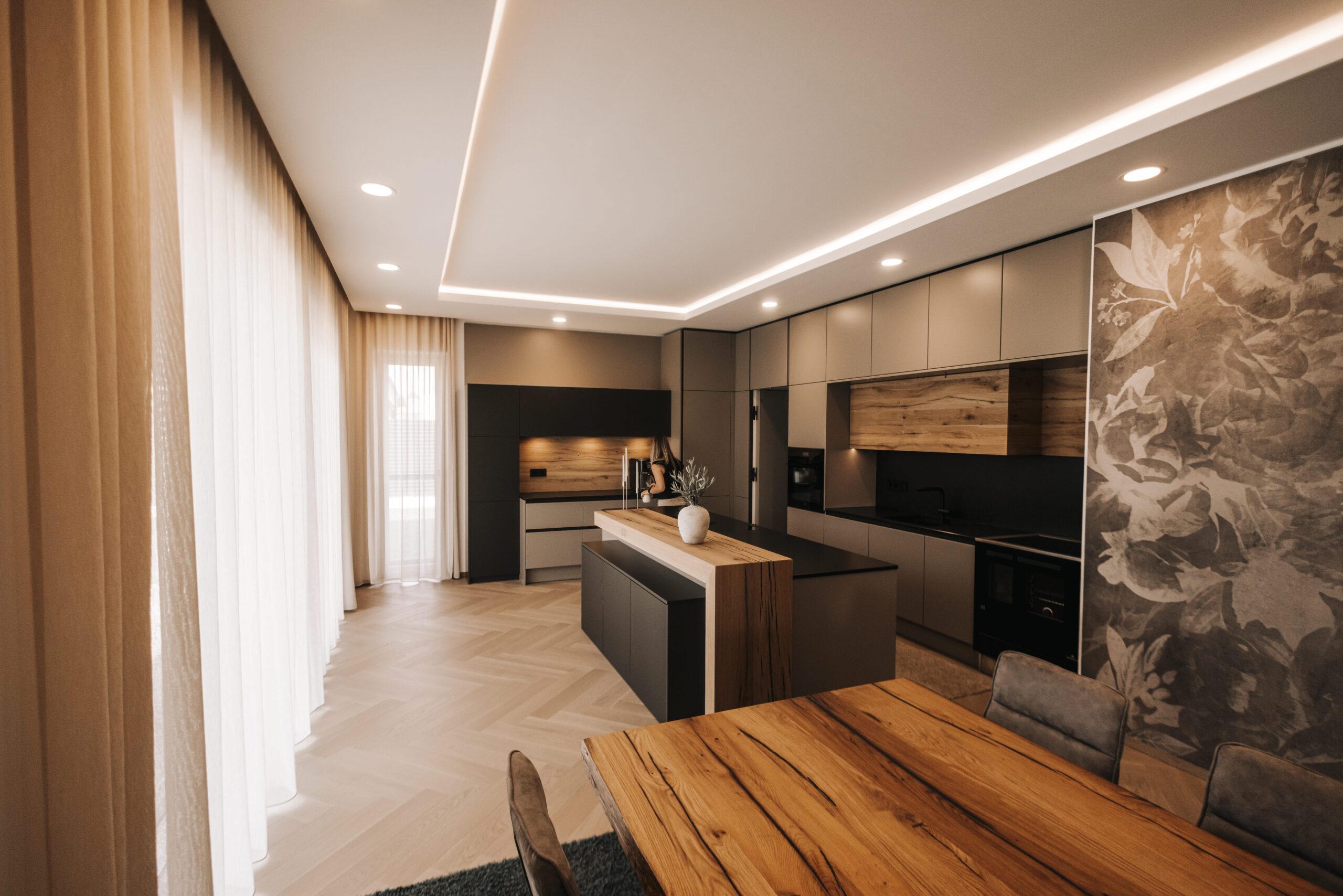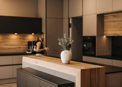 Die natürliche Ausstrahlung des Holzes verleiht der klaren, modernen Gestaltung Tiefe und Charakter – elegant, ruhig und dauerhaft schön.