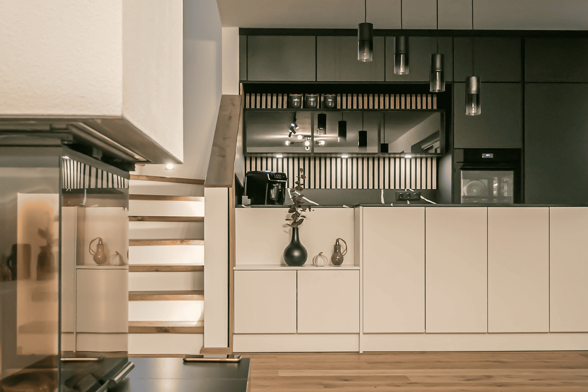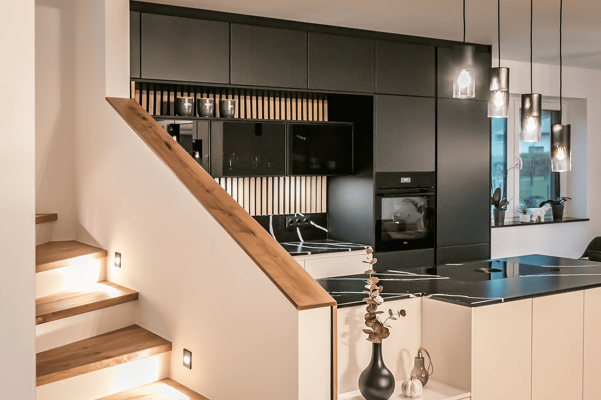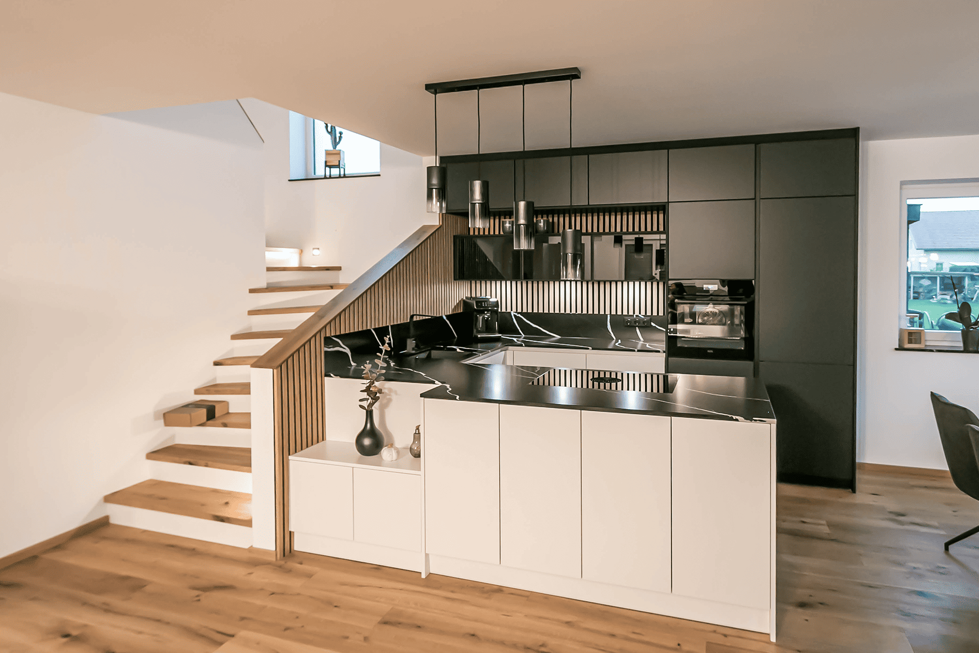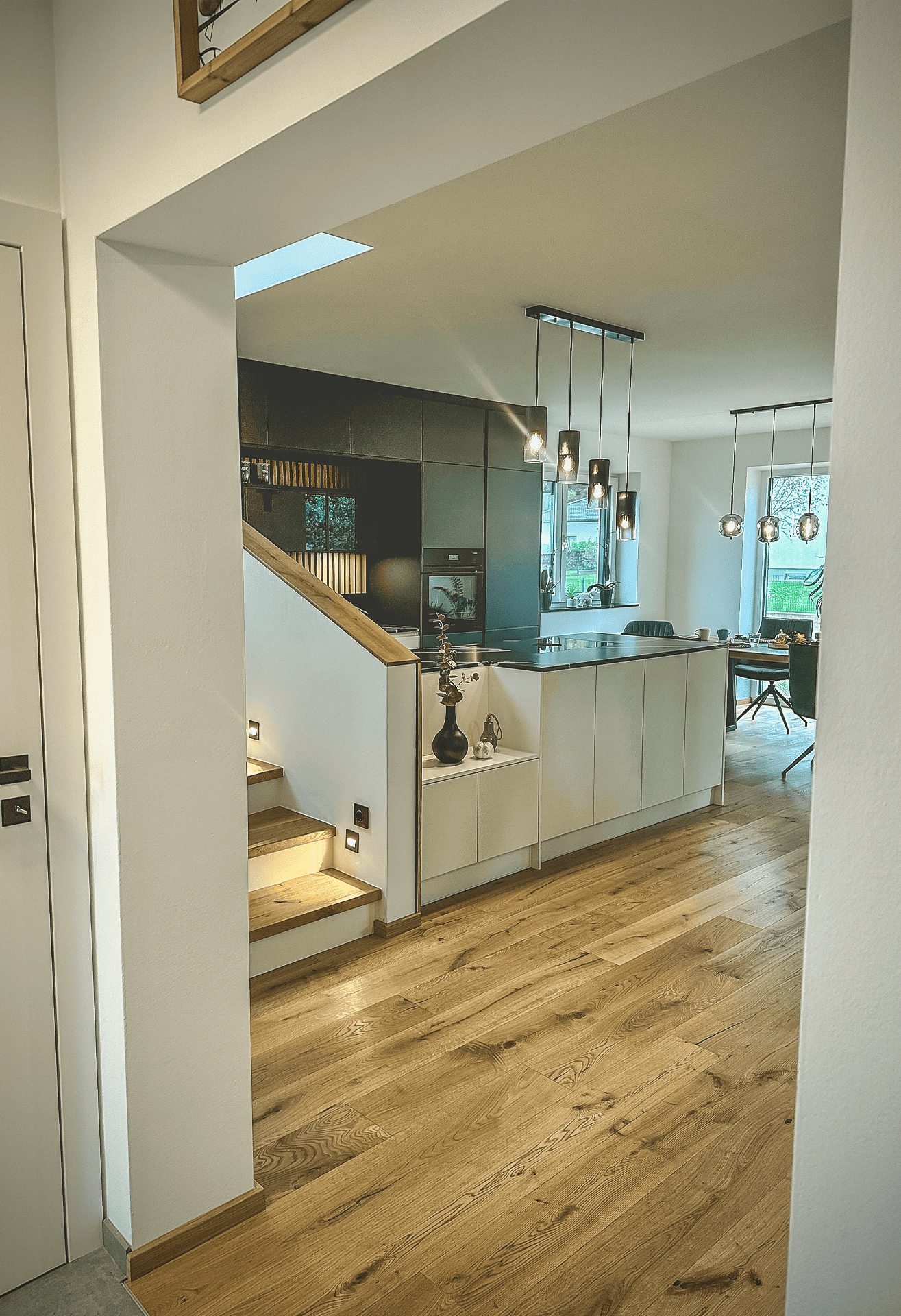 - Der Stiegenaufgang wurde mit dem Küchenkoncept vereint