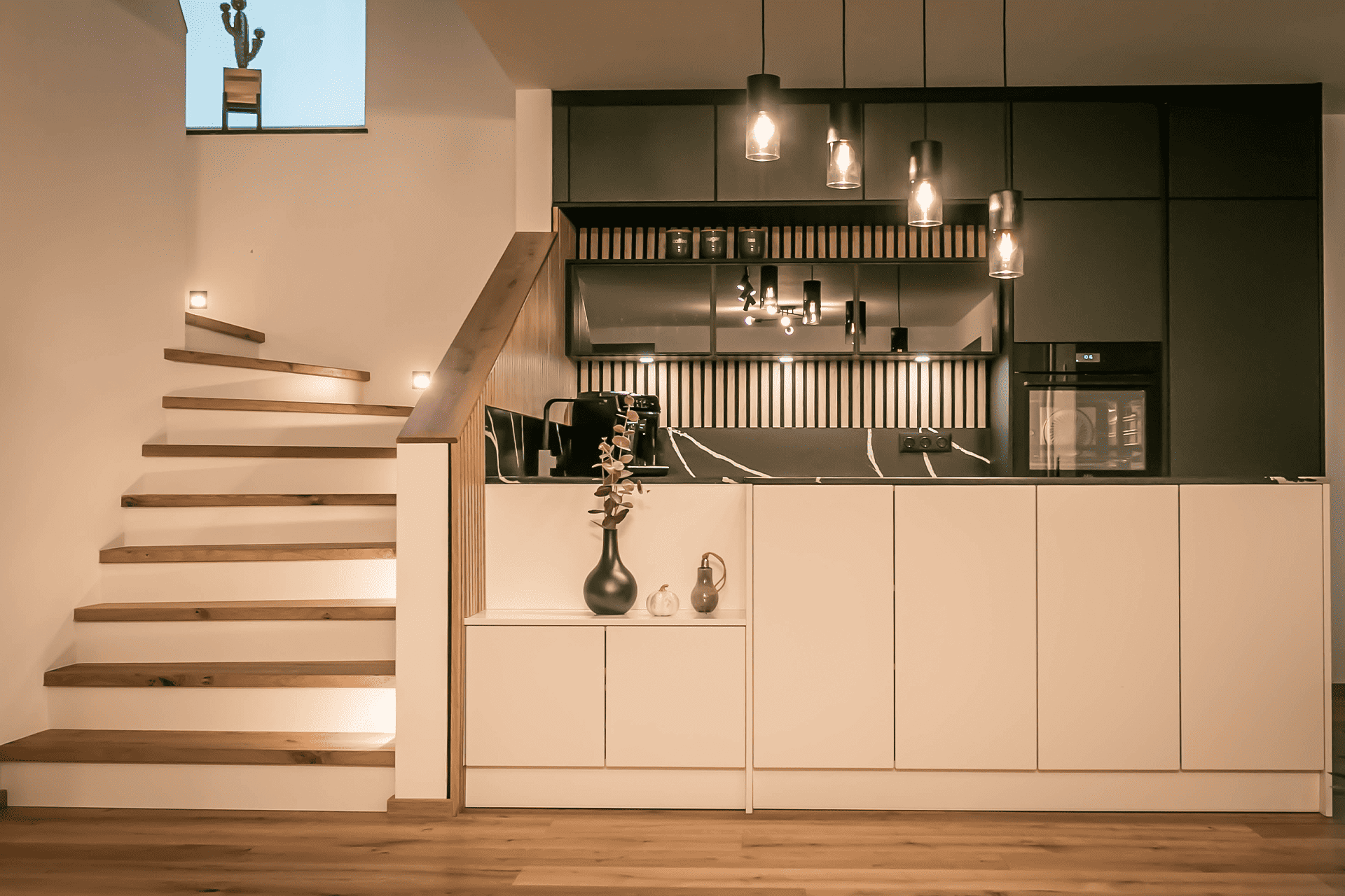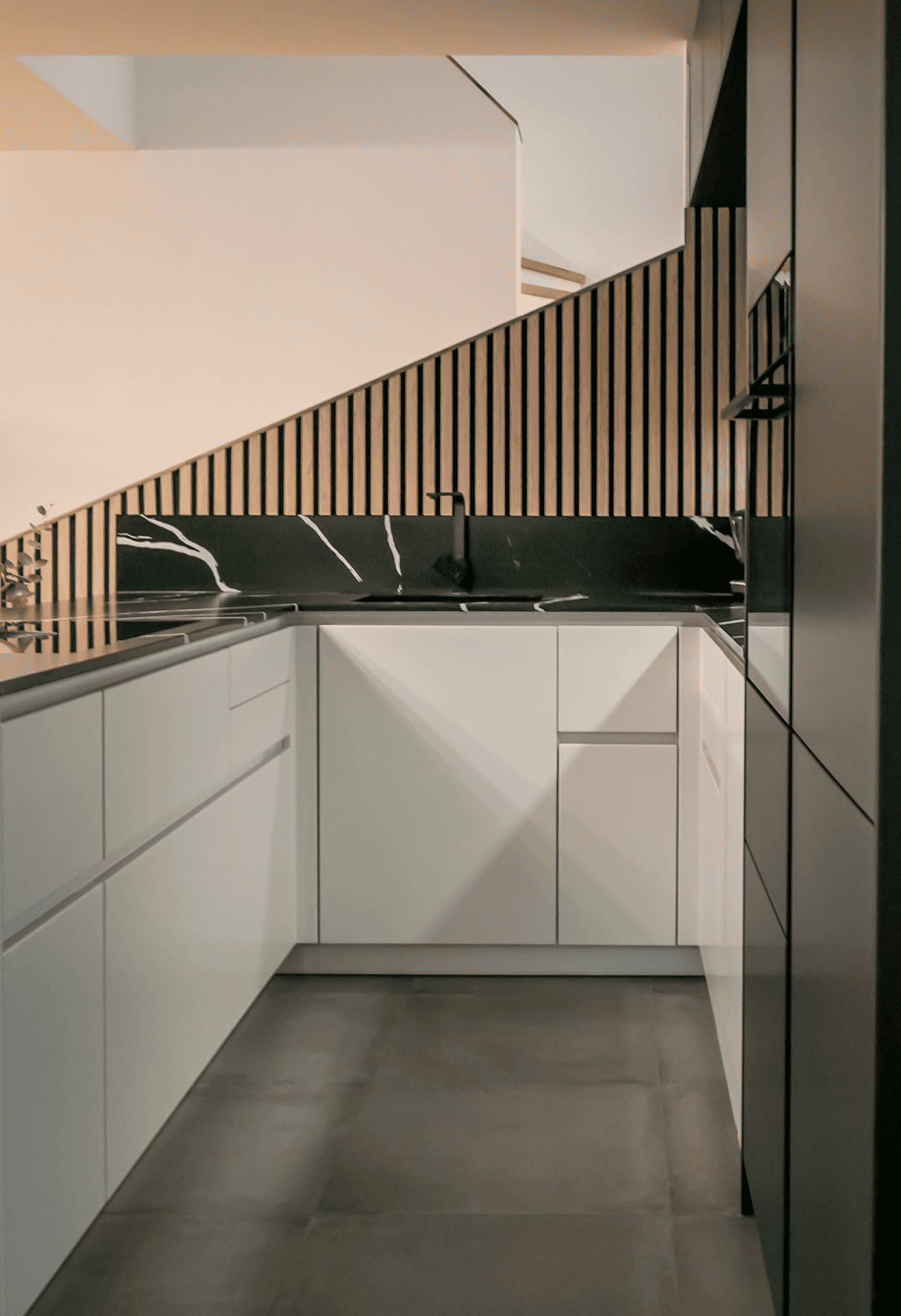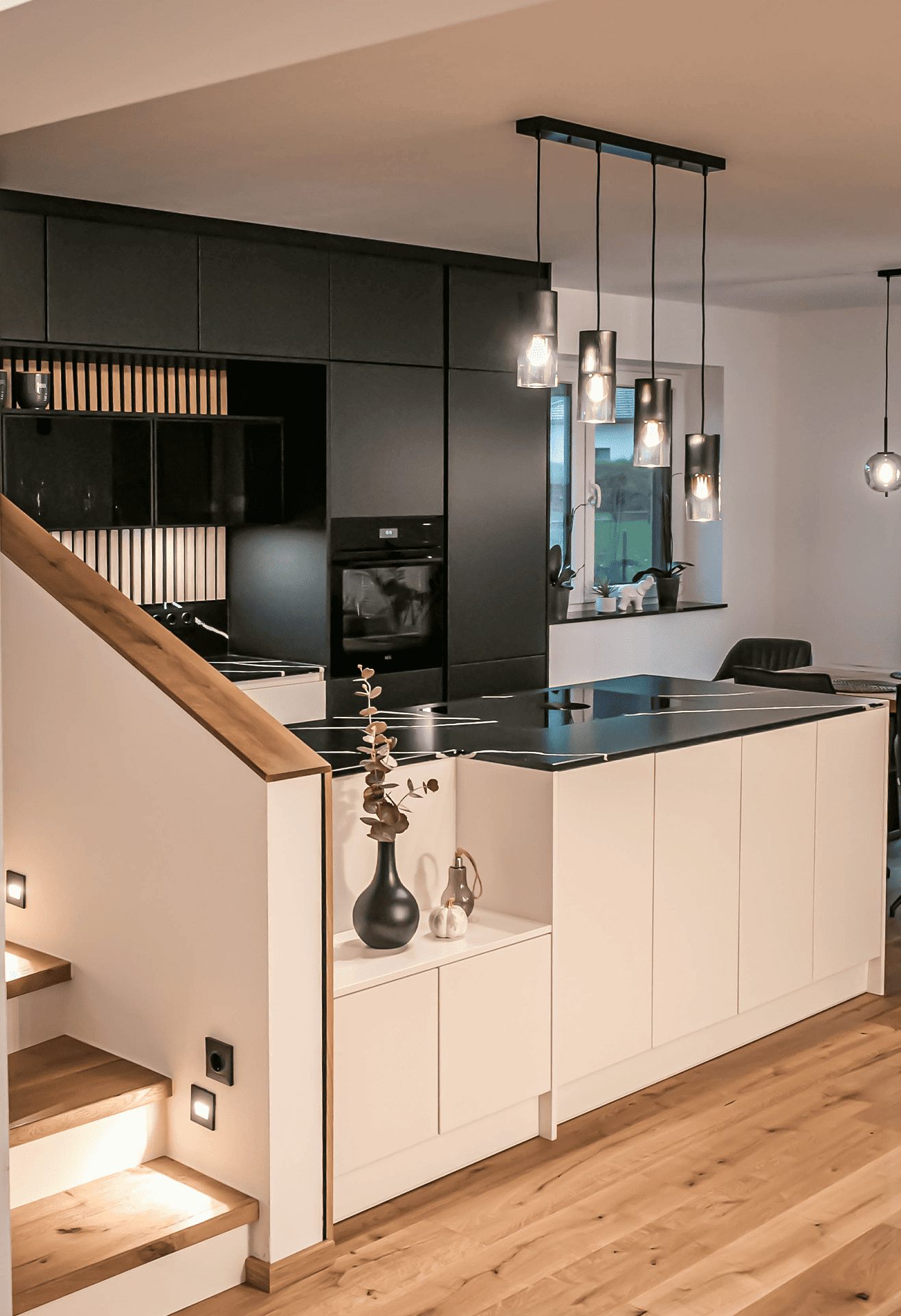 - Der Stiegenaufgang wurde mit dem Küchenkoncept vereint